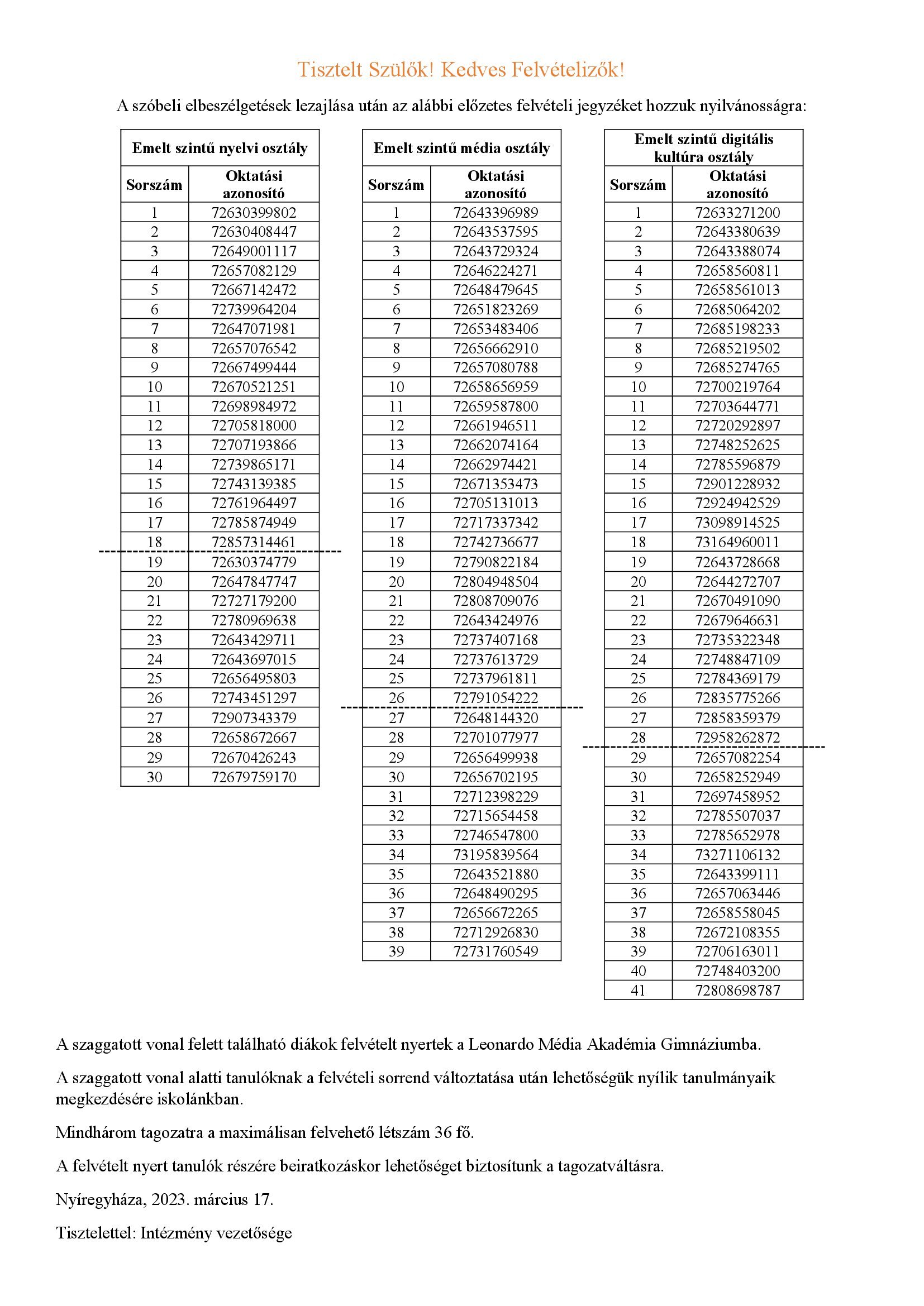 Előzetes felvételi lista 2023/24-es tanévre! 2023. április 20. csütörtök2023. március 17. péntek Szerző: LMA
