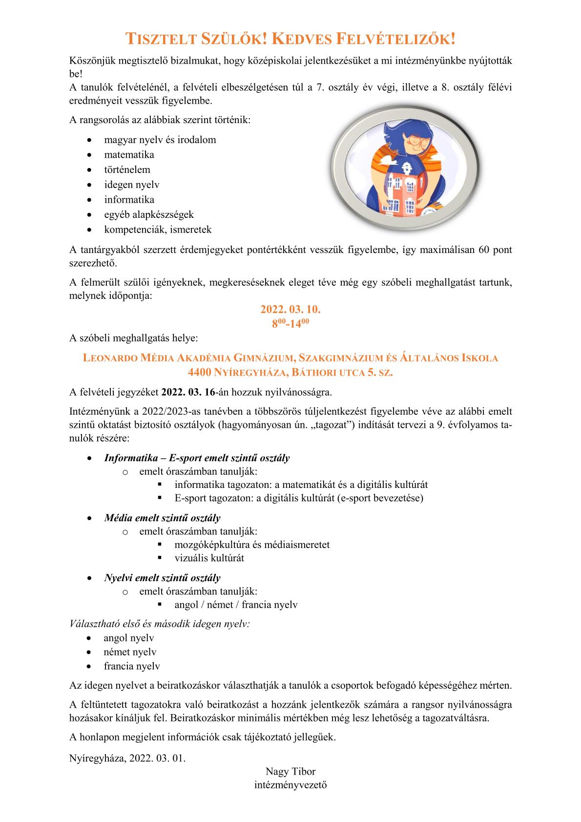 Friss tájékoztatás felvételizőknek!!!